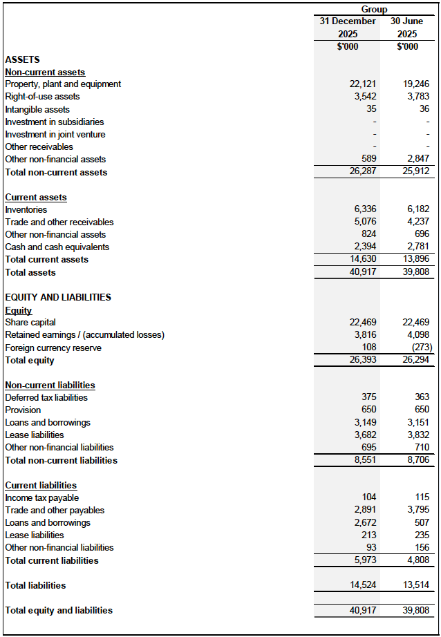 Current liabilities increased by approximately $1.2 million, from $4.8 million as at 30 June 2025 to $6.0 million as at 31 December 2025. The increase was mainly attributable to an increase in loans and borrowings of approximately $2.2 million. The increase in the loans and borrowings was primarily due to a new loan of $2.0 million obtained from directors of the Company during the current financial period, as well as an increase in bank borrowings of approximately $0.2 million arising from foreign translation of MYR-denominated borrowings, following the strengthening of MYR against the SGD.